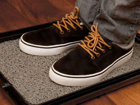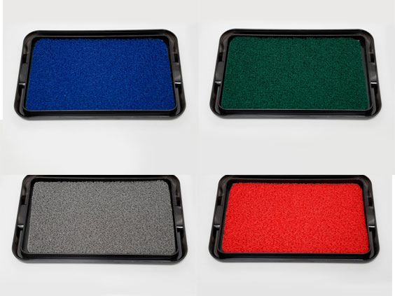 Tamaño del producto: Bandeja 33x49 cm, alfombra 27 x 43 cm. Bandeja plástica sanitizante (o pediluvio) con alfombra de rulo PVC, y topetinas antideslizantes, para la desinfección de calzados.