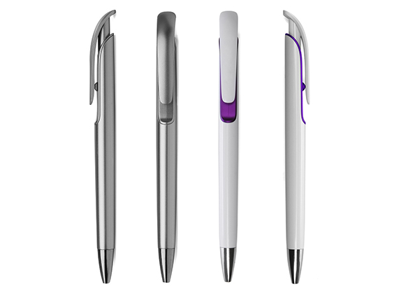 Cuerpo blanco con detalles en color bajo el clip. Puntera plata. Mecanismo de apertura retráctil. Medidas: 14,7 cm x 1 cm