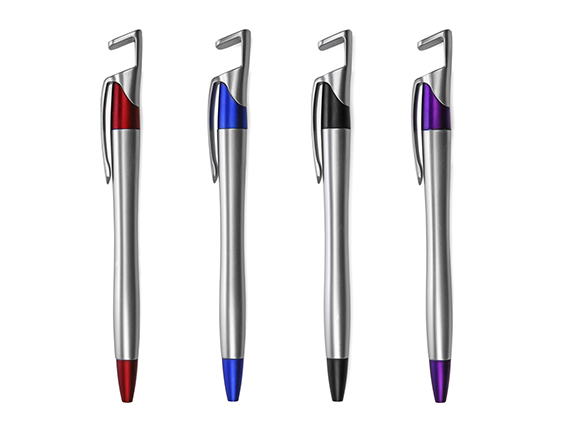Bolígrafo plástico con soporte para celular en clip. Cuerpo metalizado con detalle color en puntera y clip. Mecanismo de apertura medio giro. Medidas: 13,5 cm x 0.8 cm