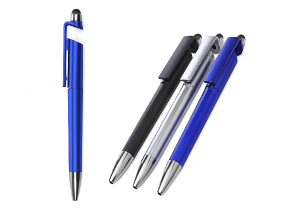 Bolígrafo plástico con soporte para celular en clip y puntera touch. Cuerpo metalizado con puntera plata. Mecanismo de apertura medio giro. Medidas: 14,5 cm x 1 cm