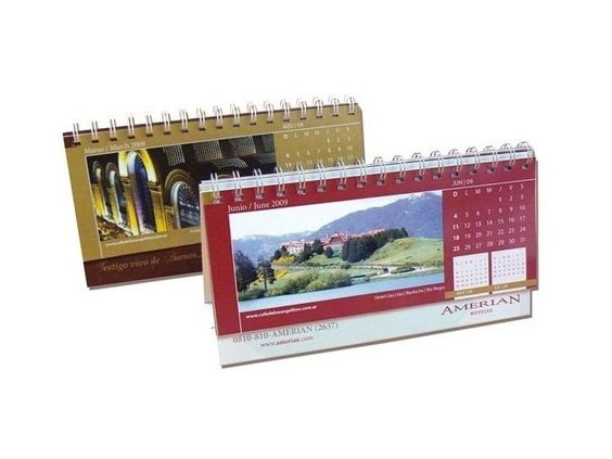 Cod. GIS-225Calendario tipo carpita, anillado superior. Doble Ring Wire.Material: Base de cartulina de 280 g. con Laca UV o Polipropileno mate.Hojas en papel Ilustración de 170 g. Dimensiones: Base: 22 x 12 cm. - Hojas: 22 x 9 cm.  Nº de hojas: 6  Peso: Consultar.  Sist. de Impresión: Offset Full Color tanto en la base como en las hojas. Hojas impresas frente y dorso.  Cantidad mínima: 300 u.