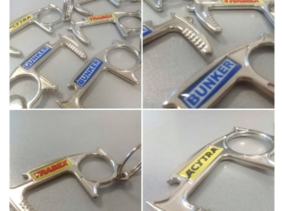 Llavero diseñador para abrir y cerrar puertas sin tocar. Pulsar botones de ascensor y cajeros automáticos.