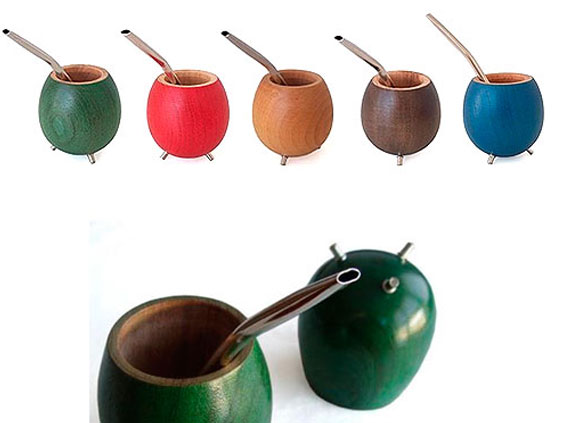 Mate de madera de Algarrobo o Caldén y patas de metal cromado.Incluye la bombilla.5 colores disponibles: Natural, Café, Rojo, Verde y azul.