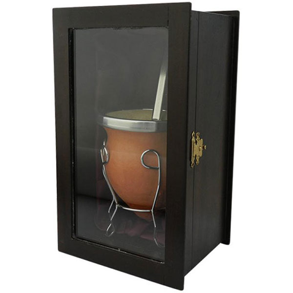 Mate de vuelo de calabaza recubierto en cuero vaqueta y bombilla de acero inox chata con caja fina.