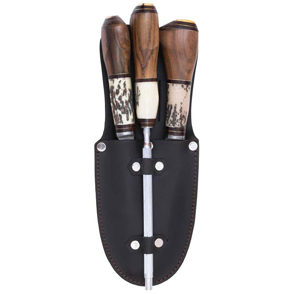 Juego Schmieden cuchillo, tenedor y chaira de acero carbono 12 cm. Incluye porta cubiertos de cuero.