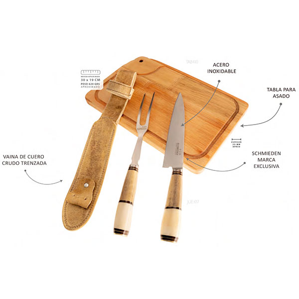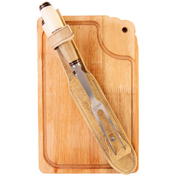 Juego parrillero de cuchillo y tenedor encabado en hueso y madera con vaina de cuero crudo más 1 tabla modelo colonial 30×19 cm de 620g.
