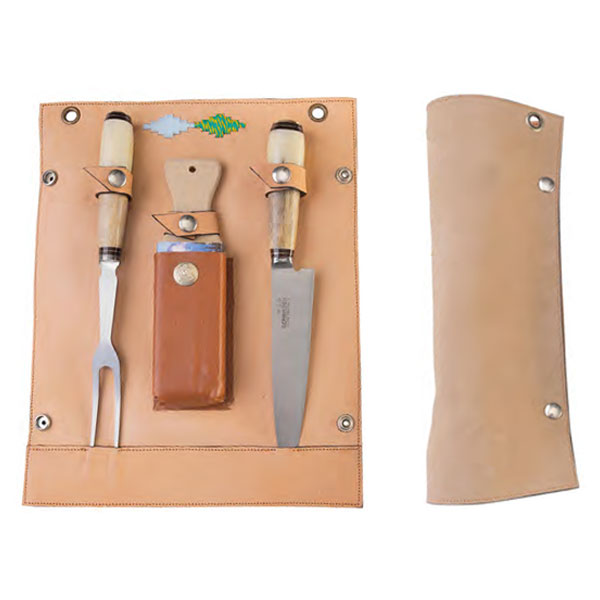 El set quincho incluye: una tabla para asado, un cucillo y tenedor Schmieden de acero inoxidable, una piedra para afilar, un estuche de cuero.