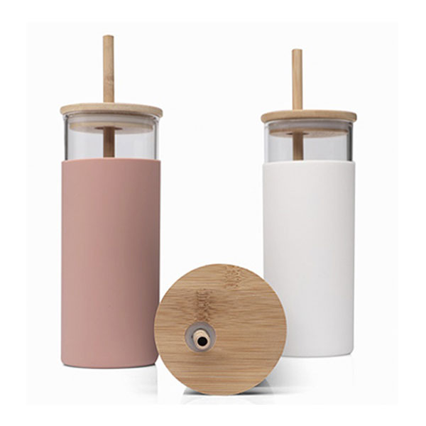 Botella de vidrio borosilicato con sorbete y tapa de bamboo.